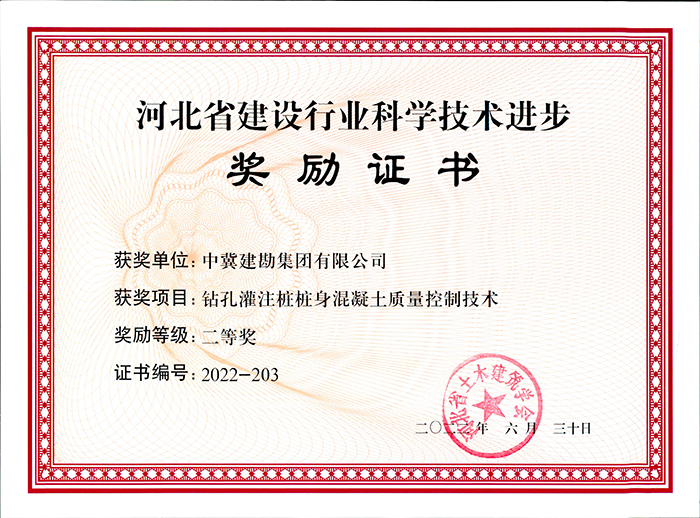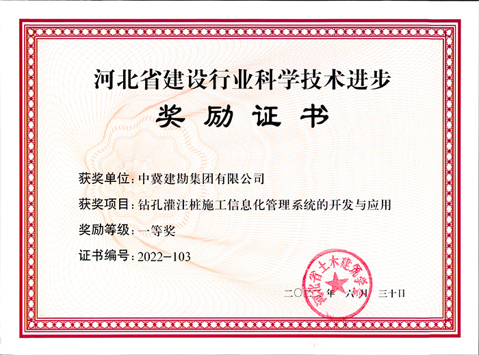 Recently, in the evaluation of the Provincial Construction Industry Science and Technology Progress Award which was commissioned by the Hebei Department of Housing and Urban-Rural Development and entrusted to the Hebei Civil Architecture Society, our company won a total of two scientific and technological achievements. Including 1 first prize: Development and Application of Information Management System for Bored Pile Construction, and 1 second prize: Quality Control Technology of Bored Pile Concrete.