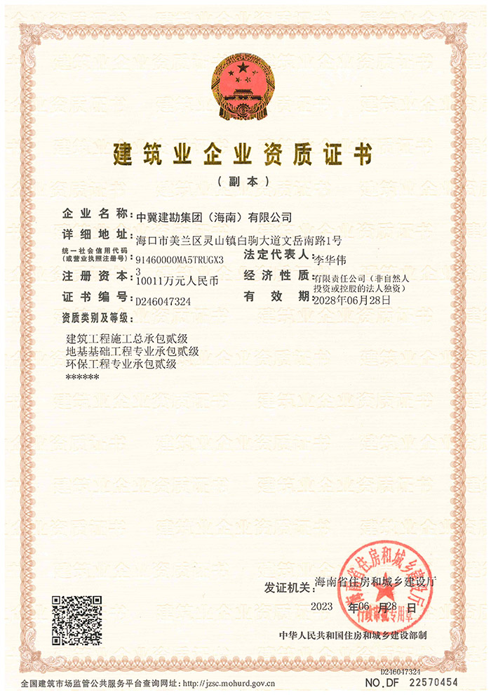 Under the strategy of the group company's leaders, on June 28, 2023, Hainan Provincial Department of Housing and Urban-Rural Development passed the application for upgrading the qualification of construction industry enterprises of China Hebei Construction & Geotechnical Investigation Group (Hainan) Ltd. and successfully obtained the qualification of Class II General Contractor for Construction Engineering, Class II Professional Contractor for Ground Foundation Engineering and Class II Professional Contractor for Environmental Protection Engineering.
