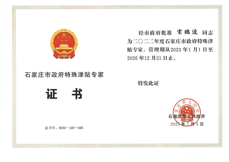 Recommended by the company, assessed by the Shijiazhuang Human Resources and Social Security Bureau, publicized by the society, and approved by the Shijiazhuang Municipal People's Government, Song Pengbo of our company was awarded the 2022 Shijiazhuang Municipal People's Government Special Allowance Expert.