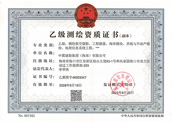 Under the leadership of the Group Company, through the careful operation of the Engineering Surveying Company and the Safety Production Department, China Hebei Construction & Geotechnical Investigation Group (Hainan) Ltd. obtained the Class B Surveying and Mapping Qualification issued by Hainan Administration of Surveying, Mapping and Geoinformation on September 20, 2023, the qualification includes five specialties: aerial photography for surveying and mapping, engineering surveying, marine surveying and mapping, boundary and real estate surveying and mapping and geographic information system engineering.