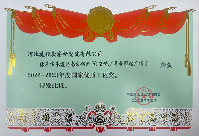 Recently, according to the selection method of National Quality Engineering Award, the project of "300,000 tons/year Electrolytic Aluminum Plant of Nanfang Aluminum Co., Ltd.", which our company participated in the construction, won the National Quality Engineering Award for the year of 2022-2023.