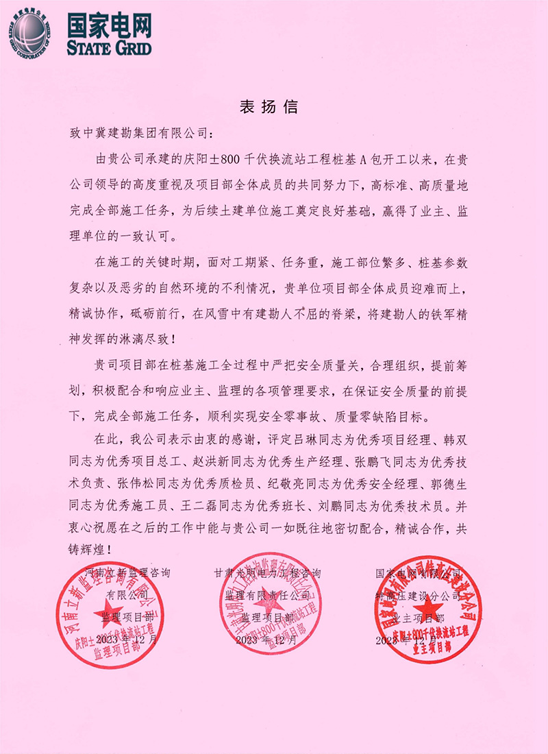 The Pile Foundation Construction Project of Kamai ±400kV Converter Station Project received a commendation letter from the owner, State Grid Corporation of China Extra High Voltage Construction Branch. The project team's spirit has won high appreciation and recognition from the owner.