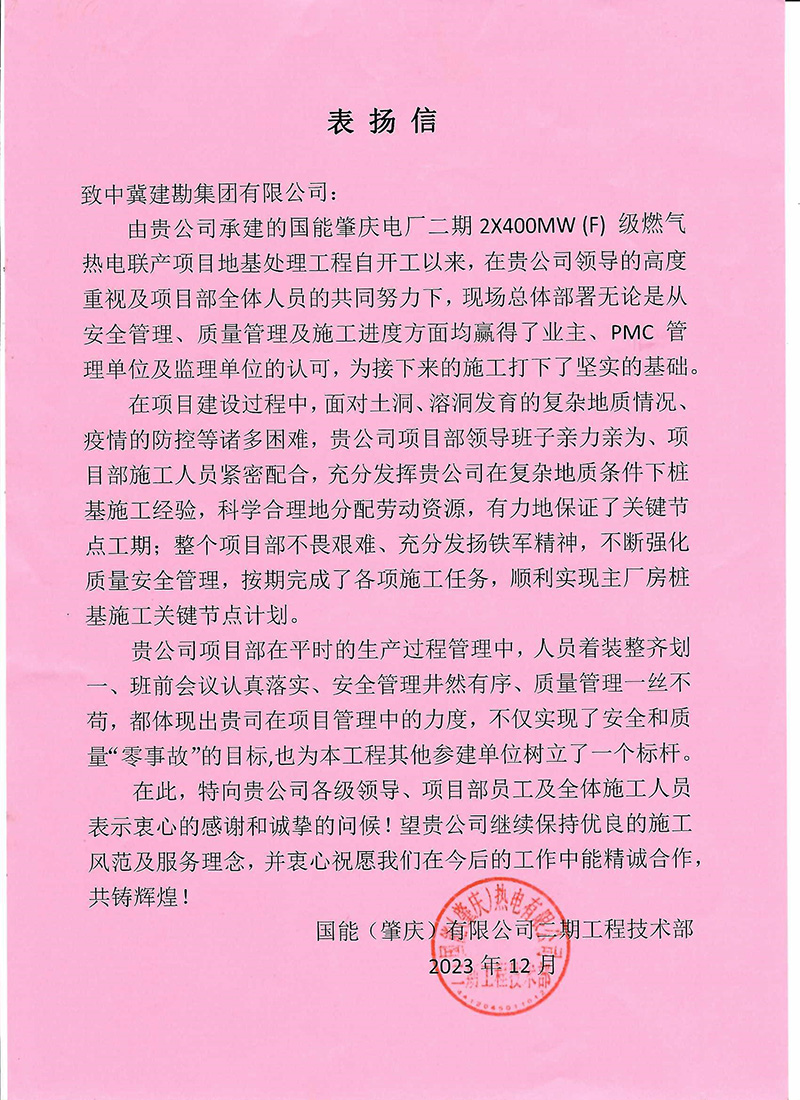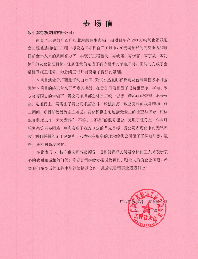 Guangxi Petrochemical Refining Project Department received a commendation letter from Niu Jiawei, Project Manager of Full Density Polyethylene Project Construction Department of Daqing Petrochemical Engineering Co., Ltd, which affirmed the achievements of our project department in Guangxi Petrochemical Refining Project Piling Project.