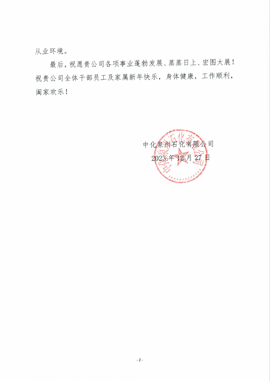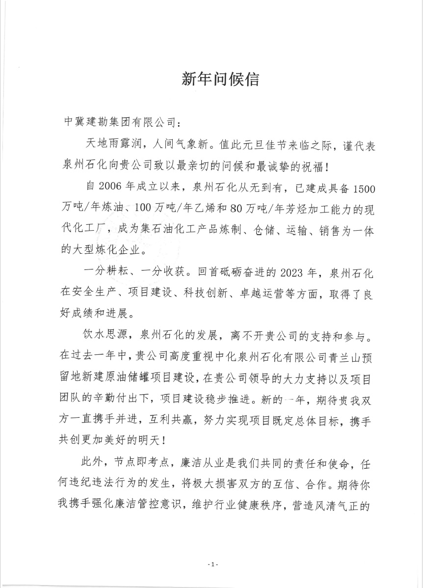 Sinochem Quanzhou Petrochemical Co., Ltd. sent a New Year greeting letter to our company, in which Sinochem Quanzhou Petrochemical Co., Ltd. affirmed the importance of our company to the construction of the New Crude Oil Storage Tank Project in Qinglan Mountain Reserved Land of Sinochem Quanzhou Petrochemical Co., Ltd. and saw the hard work of our company and project construction personnel for the project, and expected to strengthen cooperation and make new achievements in the new year.