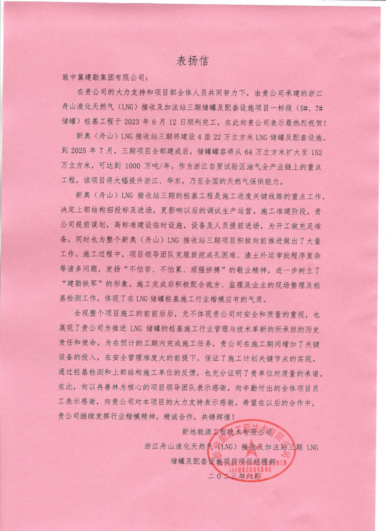 Zhejiang Zhoushan Liquefied Natural Gas (LNG) Receiving and Filling Station Phase III LNG Storage Tanks and Ancillary Facilities Project (5#, 7# Tank Piling Project) received a commendation letter on June 25, 2023 from Xindi Energy Engineering Technology Co. Since the commencement of the project, under the strong support of the company and the joint efforts of all the staff of the project department, the project has been carefully organized, fully laid out, and overcame a lot of difficulties such as heavy construction tasks in the early stage, and completed the piling construction of storage tanks in a safe, efficient and high-quality manner, which has strongly guaranteed the overall schedule of the project, and has won the unanimous recognition and praise of the supervisory organization and the owner.