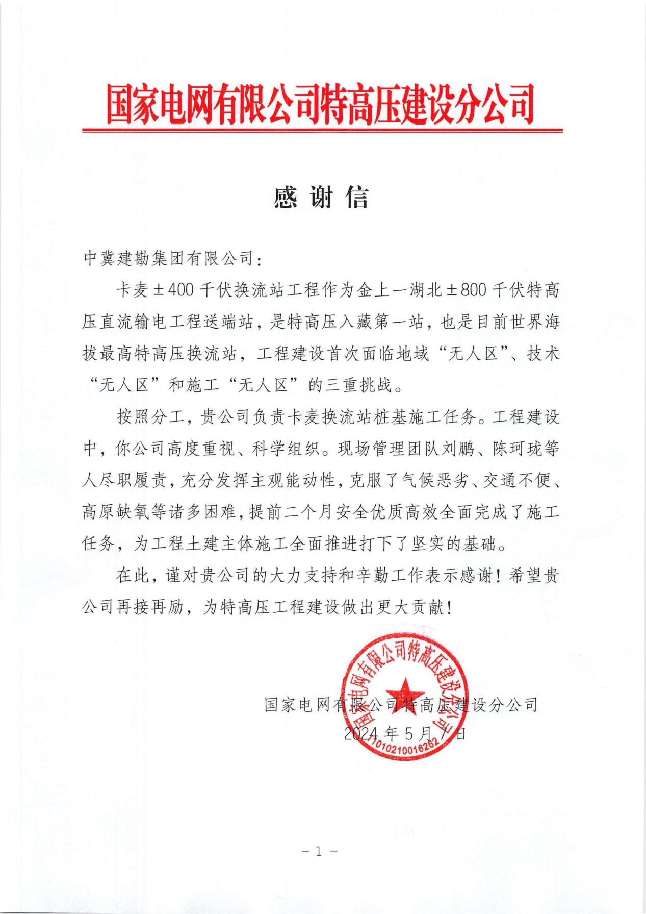 At the same time, the owners and supervisors gave high praise and affirmation, awarded our company “ Excellent Contractor” honorary title; awarded Liu Peng “ Excellent Project Manager” honorary title; Chen Kelong “ Excellent Project General Engineer” honorary title; Ji Xiaomeng “ Excellent Deputy Project Manager” honorary title; Li Xin “ Excellent Safety Director” honorary title; Zhang Heping “ Excellent Project Quality Inspector” honorary title; Wei Yaowen “ Excellent Project Technician” honorary title; Zhang Baojie “ Excellent Project Technician” honorary title; Wang Meibing “ Excellent Project Constructor” honorary title. In addition, for the outstanding contribution made by the project department in Kamai converter station, the State Grid UHV Branch specially wrote a letter of appreciation for the construction performance of our company to give affirmation and thanks, and look forward to the subsequent projects to continue cooperation and create new achievements!