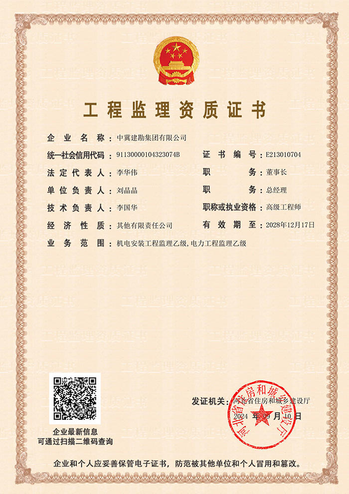In order to further expand the company's business scope and improve the qualification category of engineering supervision, the Group Company passed the audit of Hebei Department of Housing & Urban-Rural Development on September 10, 2024, and obtained Class B qualification for supervision of electromechanical installation engineering.