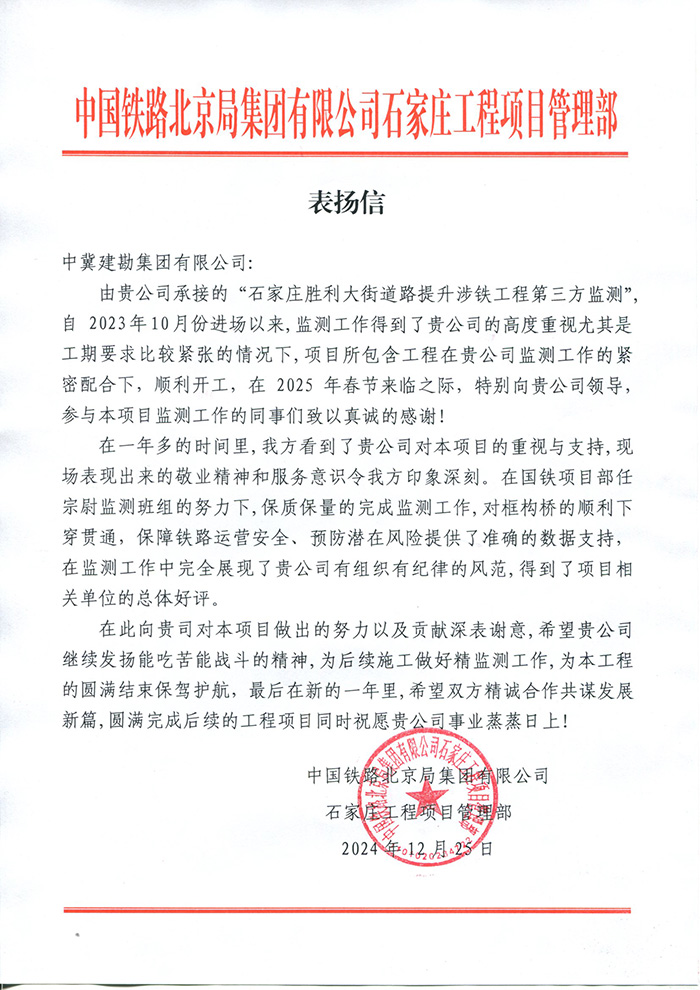 In the safety monitoring project of railway facilities involved in the upgrading of Shengli Street Road in Shijiazhuang, the Sixth Company ensured the safe operation of the railroad facilities through high-precision mapping and real-time monitoring, and won the high praise from the China Railway Beijing Group Co., Ltd. For the Beijing-Shijiazhuang Hub Improvement Project of Beijing-Shijiazhuang Passenger Dedicated Line, our accurate monitoring work provided solid data support for the smooth progress of the project, which was highly recognized and commended by China Railway Sixth Group Co., Ltd.