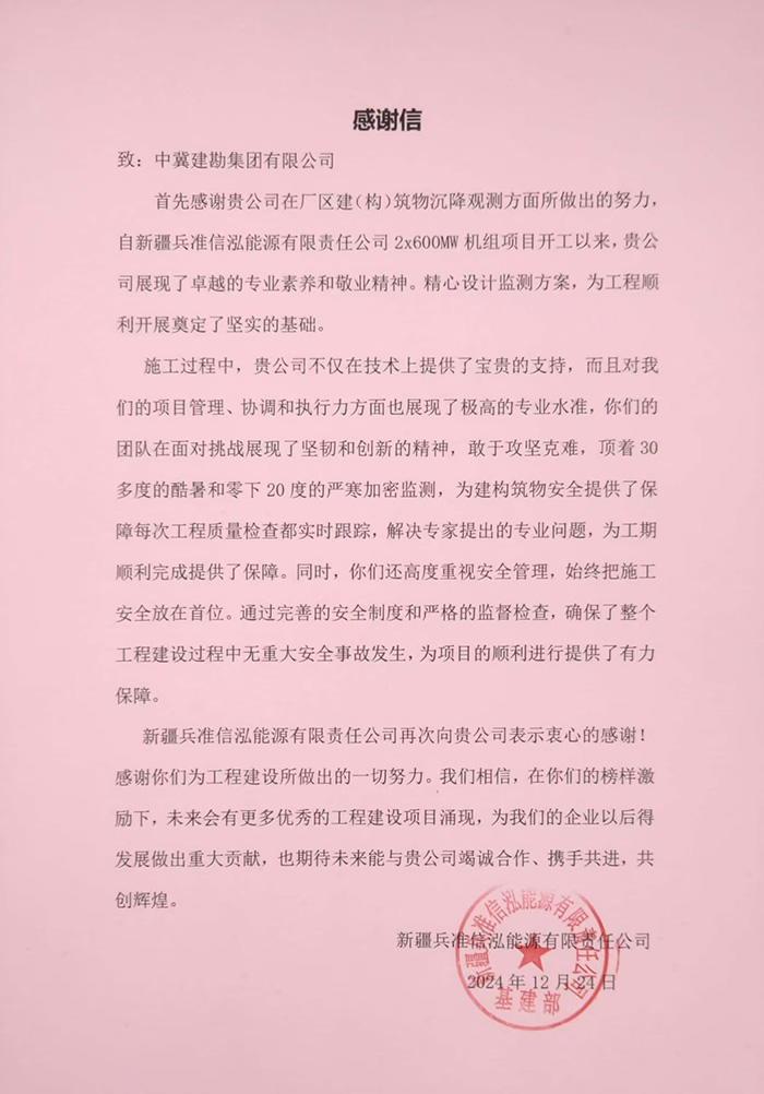 In 2x600MW Settlement Observation Project of Xinjiang Bingzhunxinhong Energy Co., Ltd., the staff of Xinjiang Project Department braved the cold and heat and monitored in 30 degrees Celsius and -20 degrees Celsius to provide data guarantee for the safety of the plant buildings and structures, and followed up the quality of the project in real time and solved the professional problems raised by the experts, which guaranteed the successful completion of the construction period. The owner sent a letter of appreciation to express the deep gratitude!