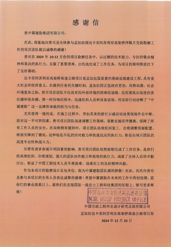The project department of Dhaka-Ashulia Viaduct Highway in Bangladesh sent a letter of appreciation to our company for the high degree of professionalism and excellent execution shown during the project investigation. Especially in the complex social environment and sudden demonstrations, our project team did not panic during the crisis and quickly adjusted the work strategy to ensure the smooth progress of the project and the safety of the personnel.