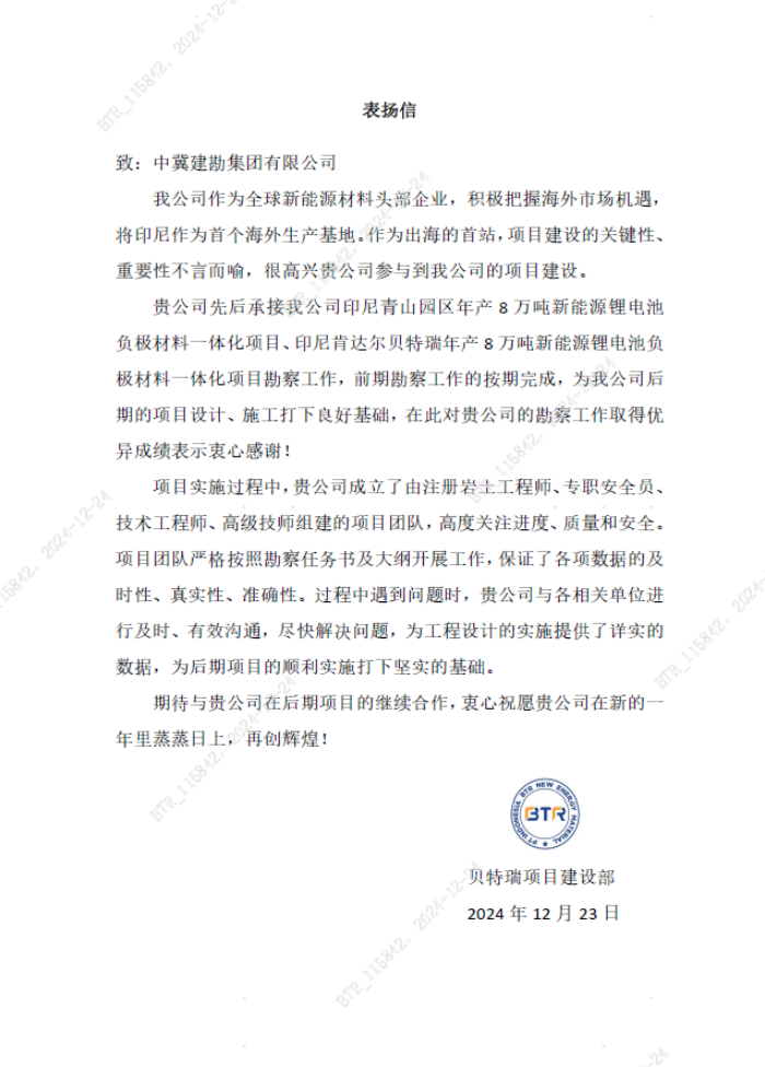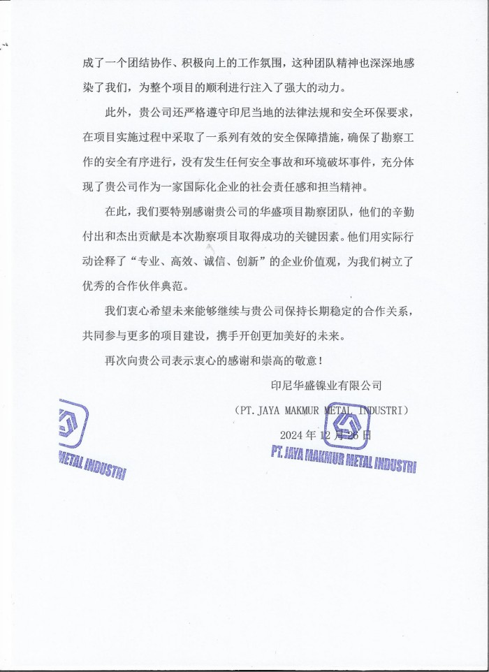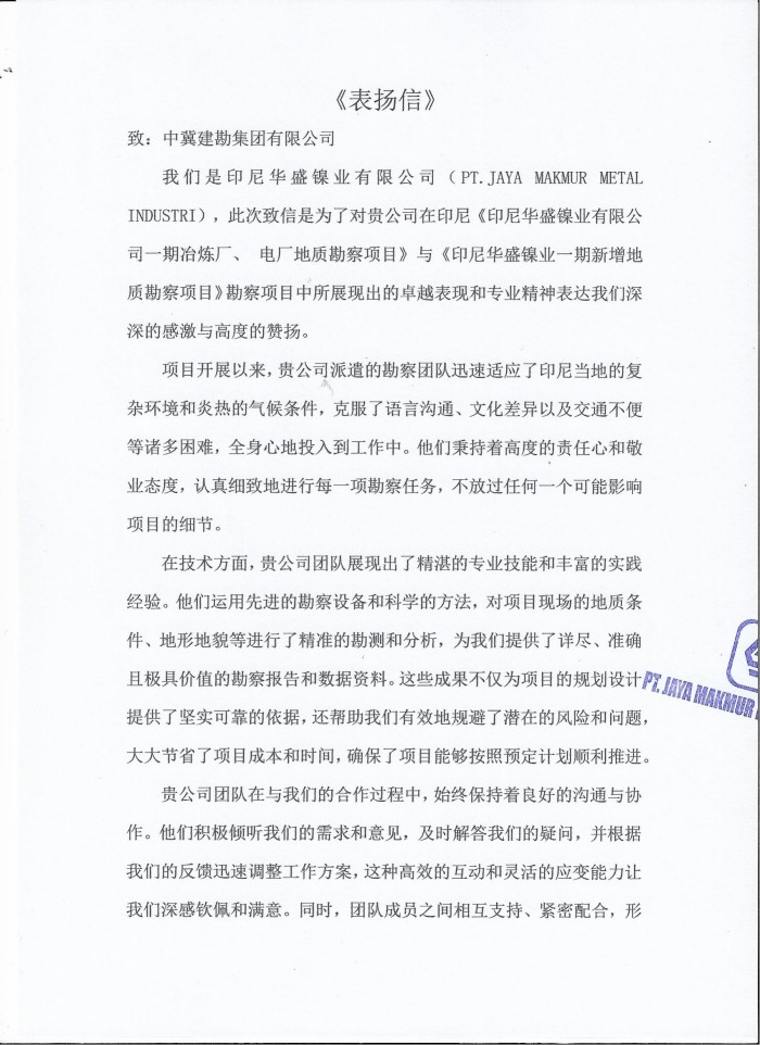 Indonesia PT. JAYA MAKMUR METAL INDUSTRI sent a letter of commendation. In the geological investigation tasks of the Phase Ⅰ smelting plant and power plant of PT. JAYA MAKMUR METAL INDUSTRI, as well as the comprehensive steel project with an annual output of 2 million tons of PT. JAYA MAKMUR METAL INDUSTRI, all employees of the Project Department quickly adapted to the complex environment and hot climate conditions in Indonesia, overcame many difficulties such as communication, cultural differences, and inconvenient transportation, and devoted themselves wholeheartedly to their work. During the project period, they strictly complied with the local laws and regulations as well as safety and environmental protection requirements in Indonesia, and adopted a series of effective safety measures to ensure the safe and orderly conduct of the survey work. This high degree of professionalism and sense of social responsibility has won high praise and deep gratitude from the owner.