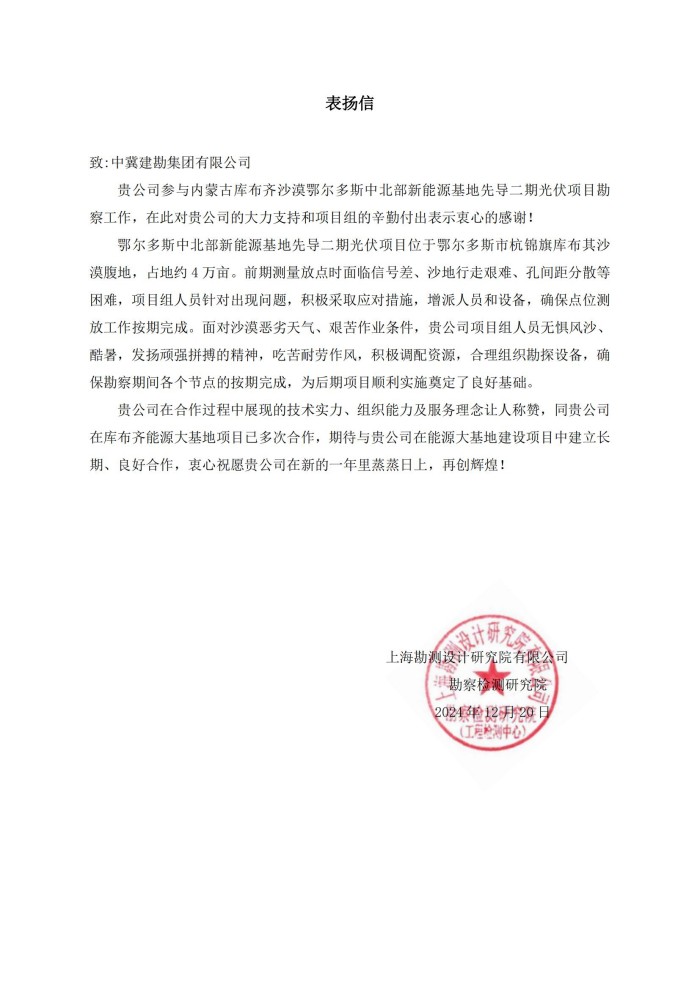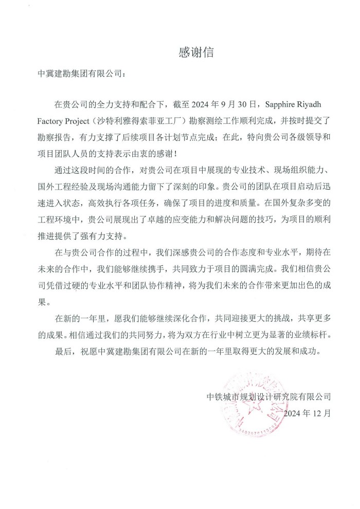 China Railway Urban Planning & Design Institute Co., Ltd. sent a commendation letter to express its heartfelt appreciation to our company and the project team for successfully completing the investigation and mapping work of Sapphire Riyadh Factory Project in Saudi Arabia and submitting the investigation report on time with the full support and cooperation of our company, which strongly supported the completion of the subsequent project nodes of each plan.