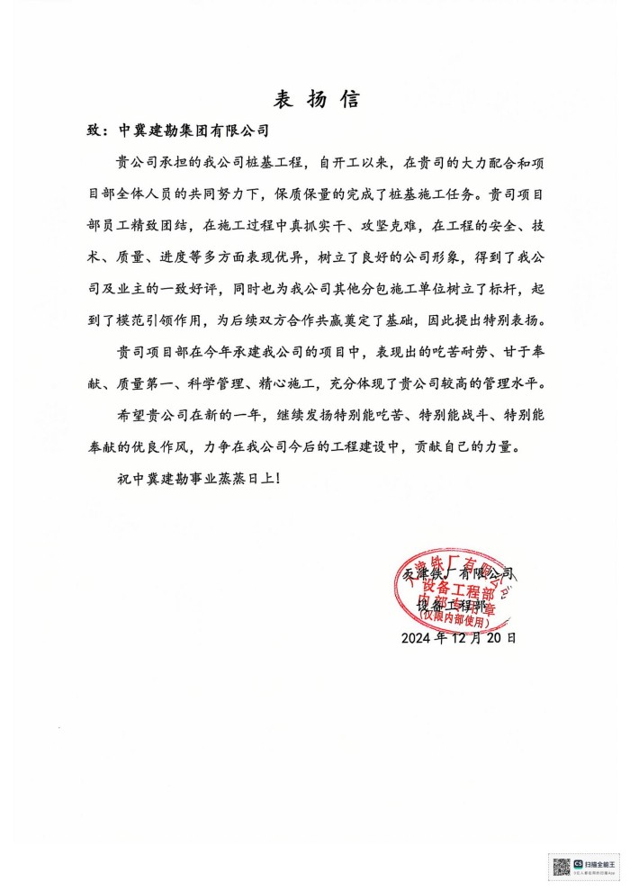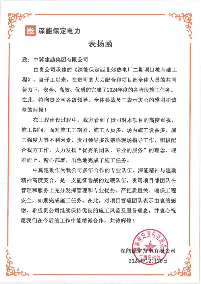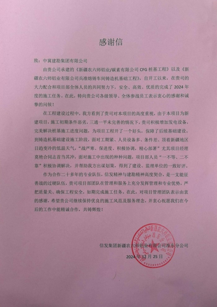 In addition, many domestic and international projects participated by our company, such as CFG Pile Project of Aluminum Industry of The Sixth Division of Xinjiang Production and Construction Corps, Photovoltaic Project of North Central New Energy Base of Erdos in Kubuqi Desert of Inner Mongolia, Pile Foundation Project of Northwest Suburb Thermal Power Plant of Shenzhen Energy Baoding Power Co., Ltd. and so on, have received letters of commendation from owners, who expressed their sincere appreciation for the high efficiency of our company's execution, rigorous management and excellent teamwork in the projects, and expressed their hope to continue to maintain close cooperation with us in the future.
