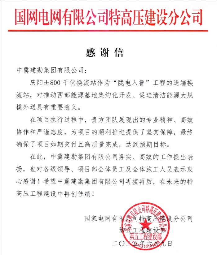 On June 9, 2025, coinciding with the official commissioning of the ±800kV Longdong-Shandong Ultra-High Voltage Direct Current (UHVDC) Project, the Group Company received a letter of gratitude from the State Grid UHV Construction Company for the Qingyang ±800kV Converter Station project. The letter highly commended our exceptional professionalism, efficient collaboration, and rigorous work ethic throughout the project execution.