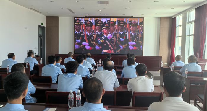 At 9:00 AM on September 3, staff from all divisions stationed in Hainan gathered in the 12th-floor conference room of the office building to collectively watch the live broadcast of the September 3rd military parade. This solemn event commemorated the 80th anniversary of the victory in the Chinese People's War of Resistance Against Japanese Aggression and the World Anti-Fascist War, serving as a moment to honor history and unite for justice and peace. Over 50 attendees included leaders from the Group Company, staff from No. 9 Division, No. 10 Division, Commercial Trading Unit 2, Hainan Real Estate Operations, and Property Management Unit, and representatives from No. 12 Division.
